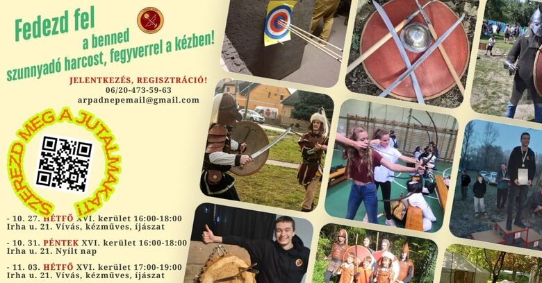 XVI. ker. Irha u. 21. gyerek és fifi hagyományőrző foglalkozás. 17:00-19:00 HÉTFŐ (Íjászat, vívás, kézműves).